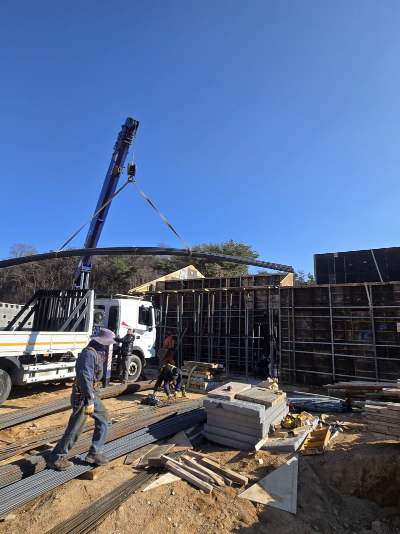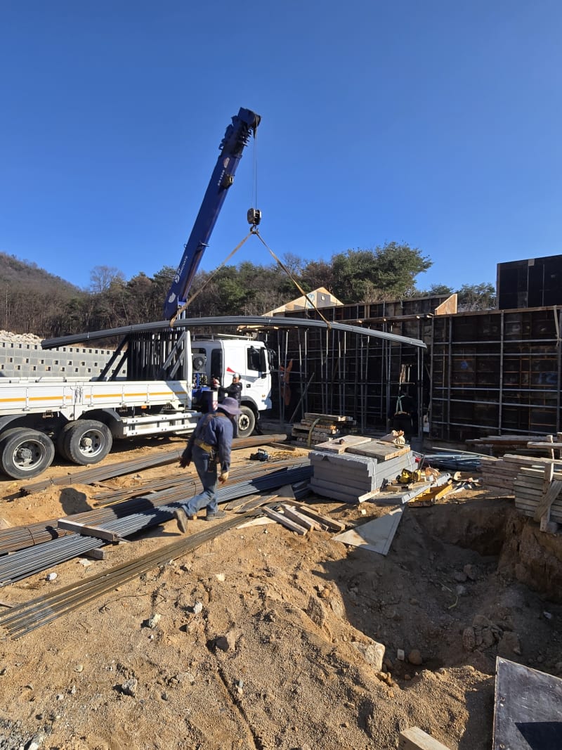 주택 현장은 대형 건설 현장과 달리 진입로가 좁고 하역 공간이 제한적인 경우가 많습니다. 이번 현장도 산자락에 위치한 주택 부지였지만, 크레인 카고 트럭을 활용해 트럭 적재함에서 바로 현장으로 철근을 내릴 수 있었습니다.