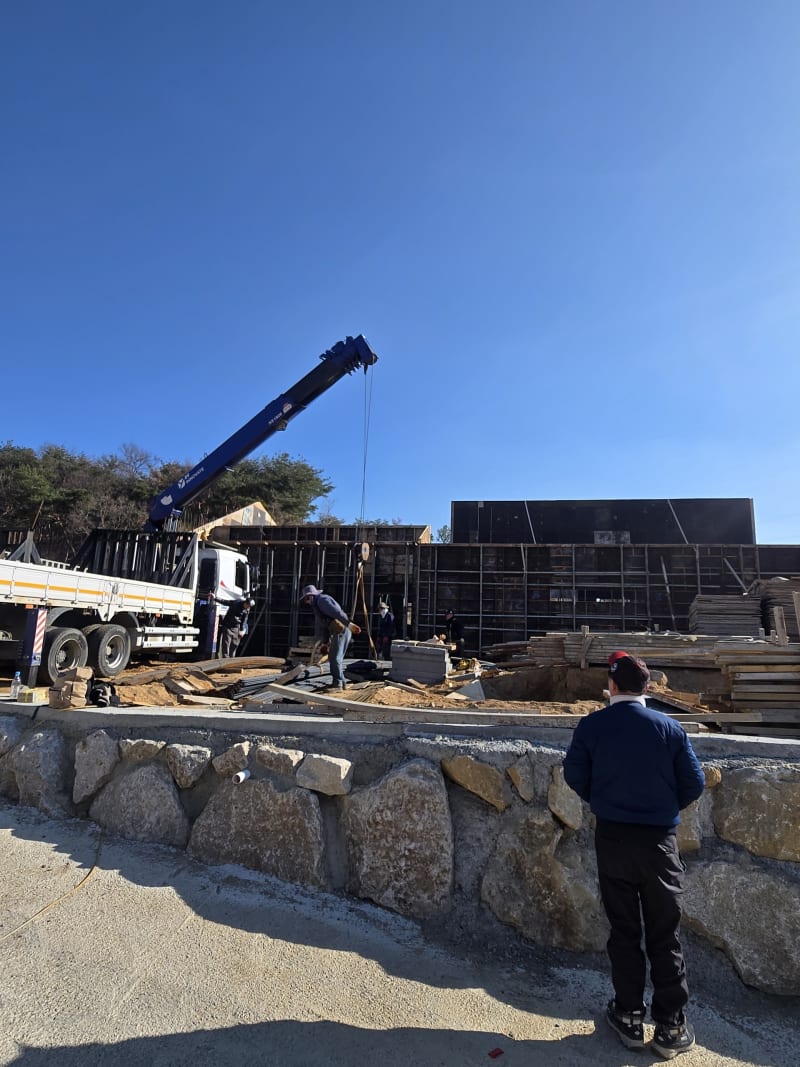 이번 현장은 석축 옹벽 위에 기초를 잡는 구조였습니다. 거푸집과 철근 배근이 이미 상당 부분 진행된 상태에서 추가 물량 투입이 필요했고, 현장 작업자들과 협의해 배근 작업에 방해되지 않는 위치에 하역을 완료했습니다.